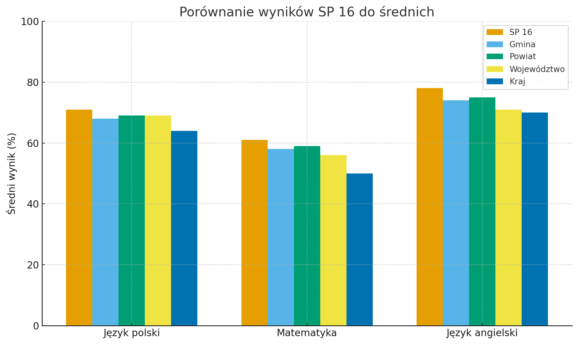 Najwyższy wynik w SP 16 osiągnięto z JĘZYKA ANGIELSKIEGO – średnio 78% (77,8%)