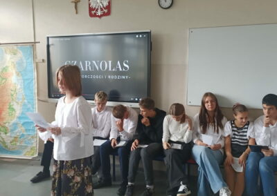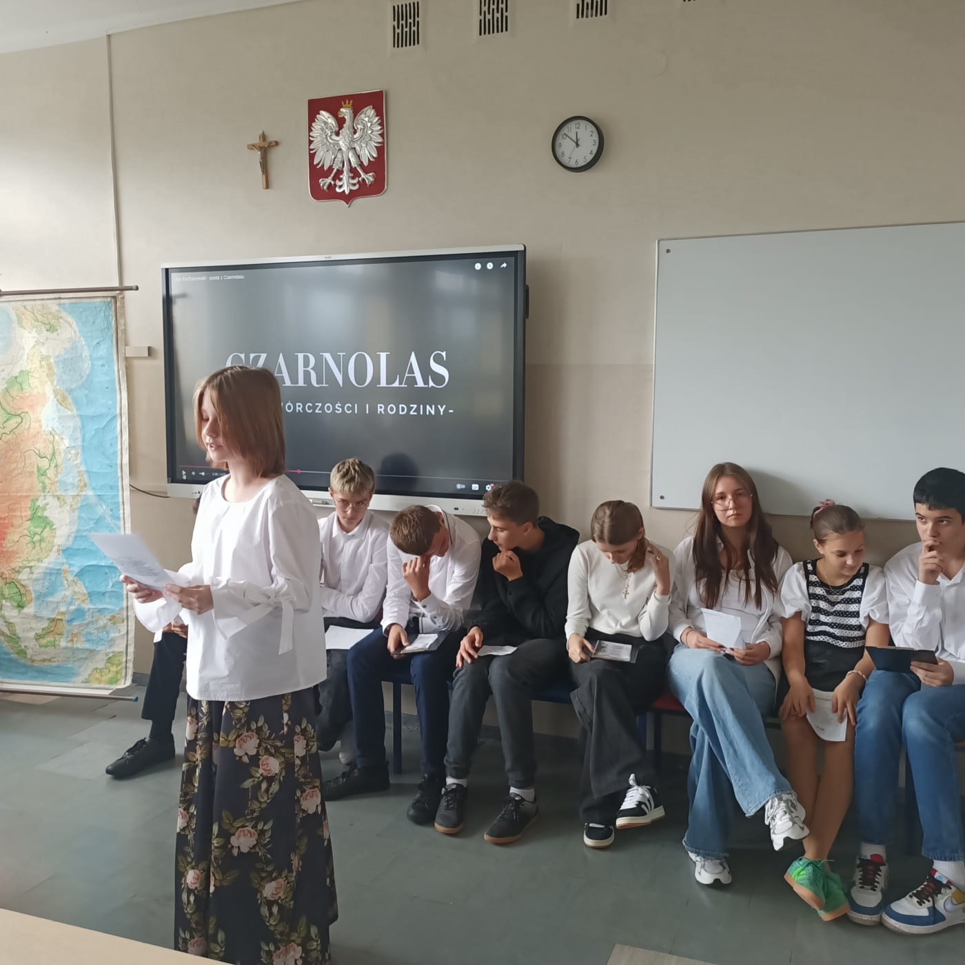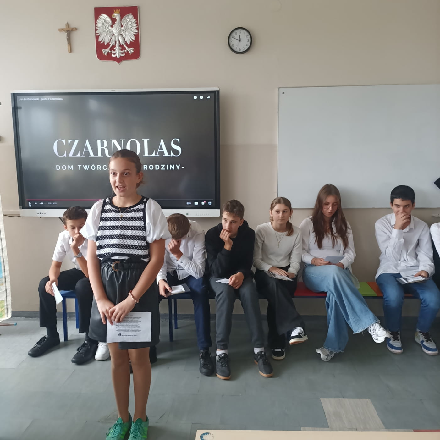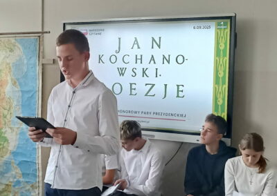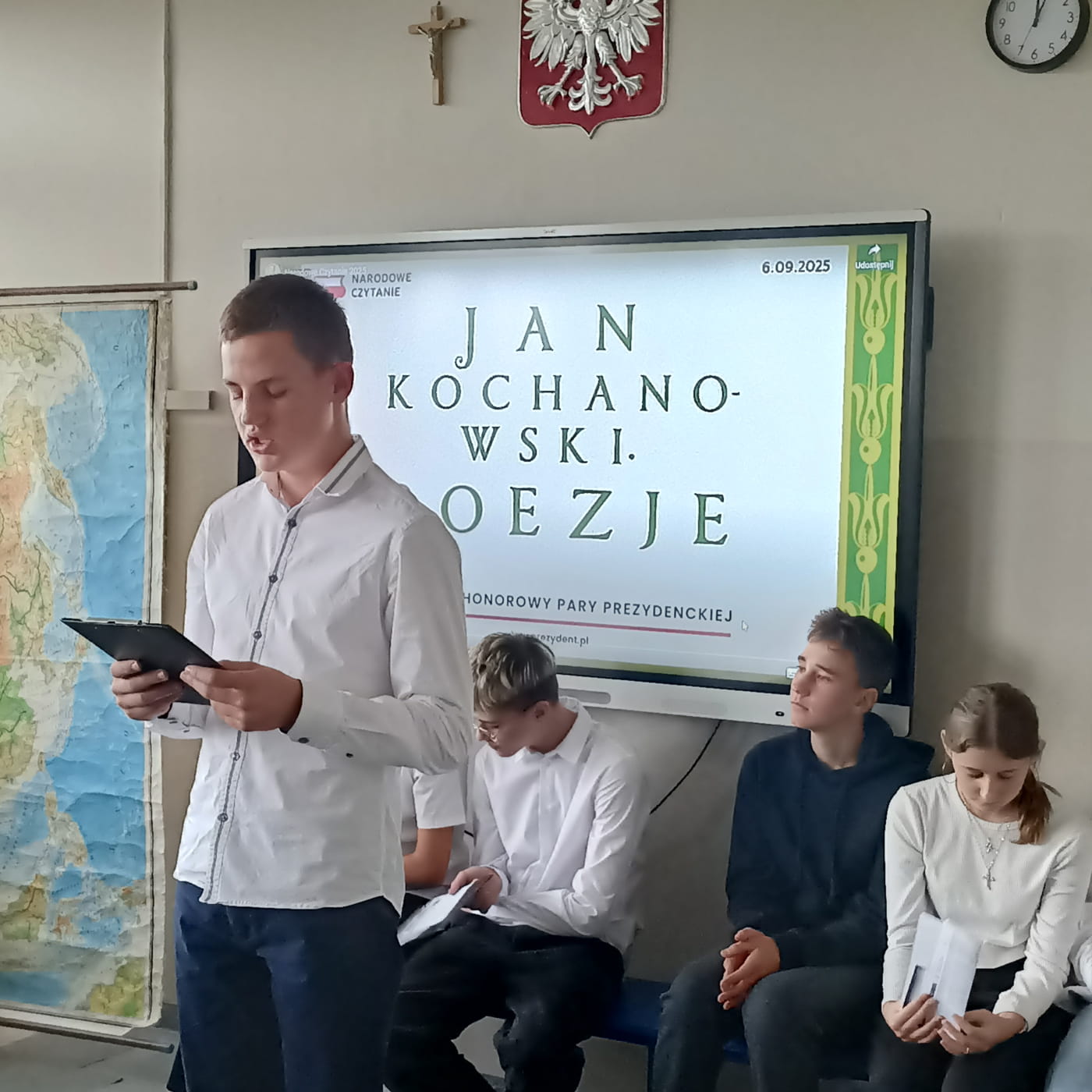 Uczniowie klasy 5b i 7a wzięli udział w Narodowym czytaniu poezji Jana Kochanowskiego. Przybliżyli sylwetkę jednego z najwybitniejszych poetów polskich. Zaprezentowali fraszki, pieśni i treny, poruszające uniwersalne tematy.