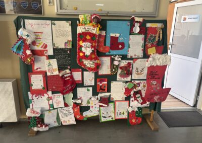 W klasach I–III uczniowie mieli za zadanie wykonać świąteczną skarpetę wraz z życzeniami w języku angielskim.
