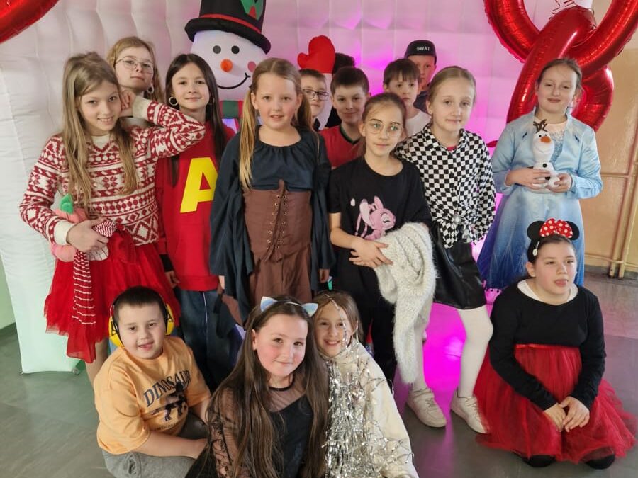 Sala gimnastyczna zamieniła się w kolorową, bajkową krainę. Na ścianach wisiały serpentyny, balony i błyszczące girlandy, a pod sufitem wirowały kolorowe światła. Z głośników płynęła wesoła muzyka, przy której trudno było usiedzieć w miejscu.